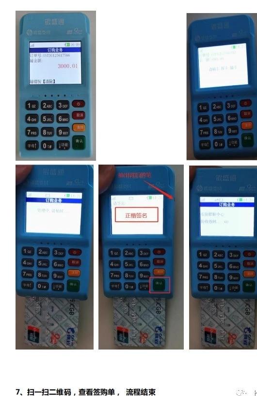 6機(jī)器激活操作流程:機(jī)器按紅色按鍵開機(jī)會(huì)自動(dòng)更新參數(shù)后,簽到01 密碼0000 →主頁面選1訂購業(yè)務(wù)→輸入金額(商戶首次用本人信用卡刷卡≥3000元視為激活)→輸入密碼,刷卡(每一張卡首次交易都需要插卡/刷卡后才可以進(jìn)行閃付)