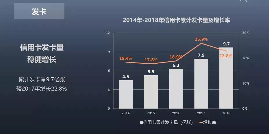 其中,信用卡累計發卡量為9.7億張,較2017 年底增長22.8%,信用卡人均持卡量為0.7張;借記卡累計發卡量為68.6億張,較2017年底增長9.9%,借記卡人均持卡量為4.92張。