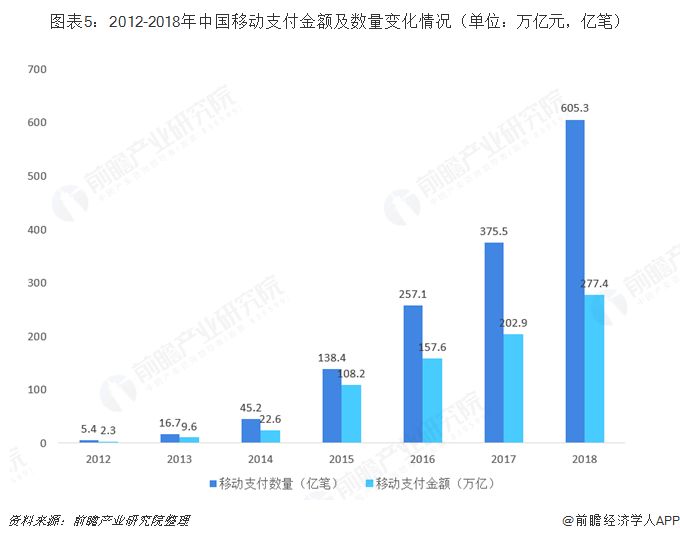 據(jù)中國(guó)支付清算協(xié)會(huì)最新數(shù)據(jù)顯示,2017年,中國(guó)移動(dòng)支付規(guī)模達(dá)202.93萬(wàn)億元,全球排名第一,近五年移動(dòng)支付規(guī)模年復(fù)合增速高達(dá)117.6%;2018年,中國(guó)移動(dòng)支付業(yè)務(wù)605.3億筆,金額277.4萬(wàn)億元,同比分別增長(zhǎng)61.2%和36.7%。